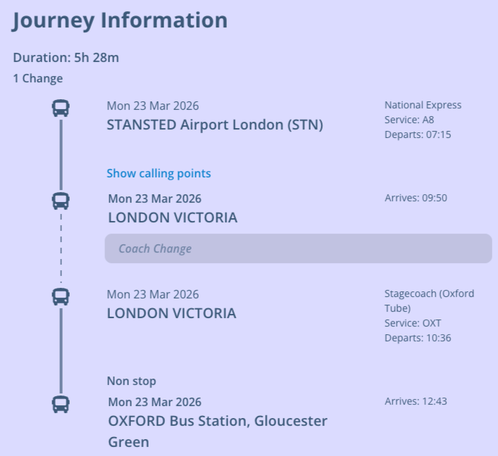 Example 9: London Stansted - Central Backpackers by bus (National Express Journey Information)