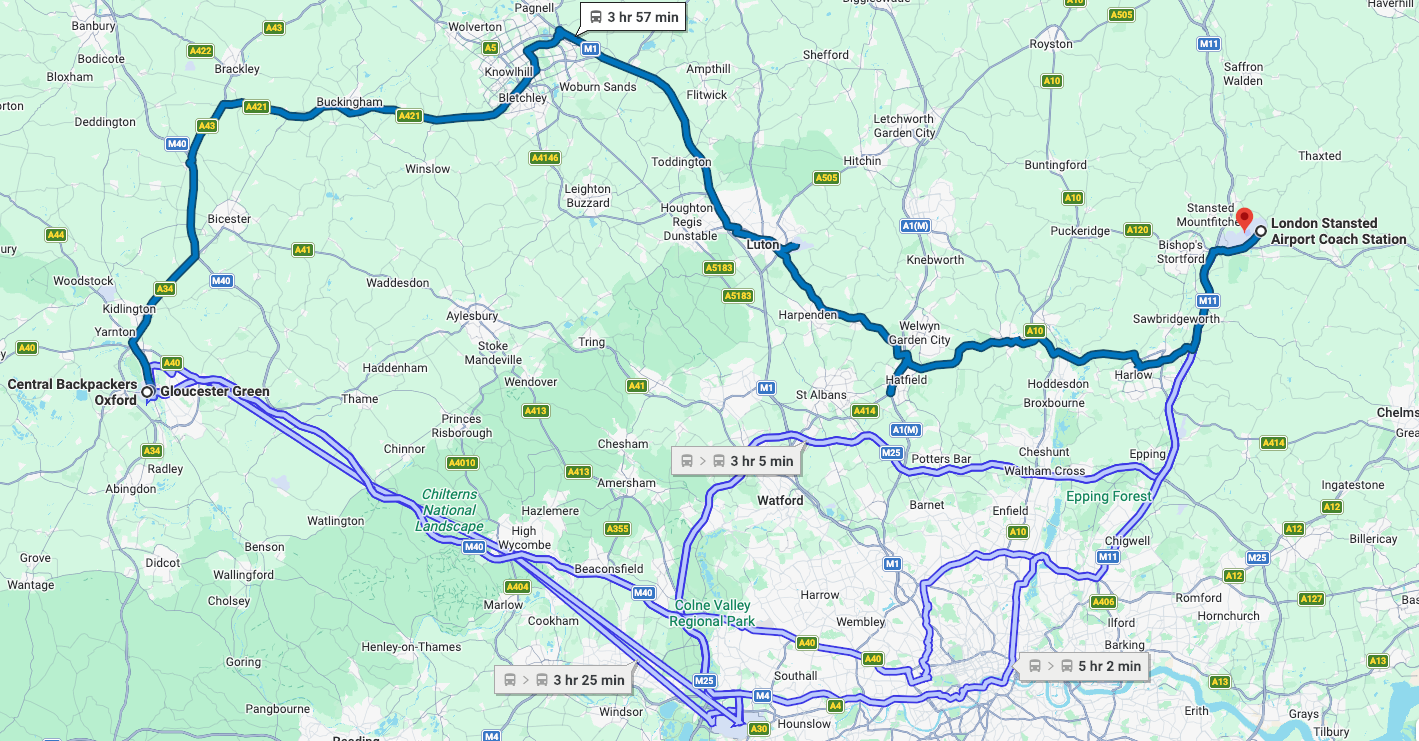 Take the National Express coach “Stansted Express” (examples 8 and 9) → The direct route will take you to Oxford Gloucester Green (last stop) through Luton and you don’t have to worry about changing transport. The drive is about 4 hours long. This bus runs approximately every two hours.